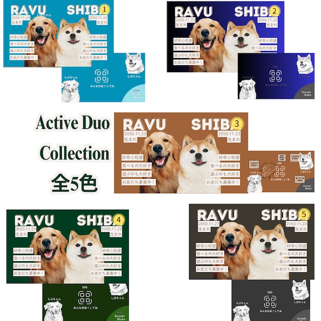 うちこの子 名刺 作成 100枚(うちの子2名様用)【Active Duo Collection 全5色】|写真×線画イラスト両面仕様|犬・猫オーダー名刺(うちの子ギフト対応) ペット名刺