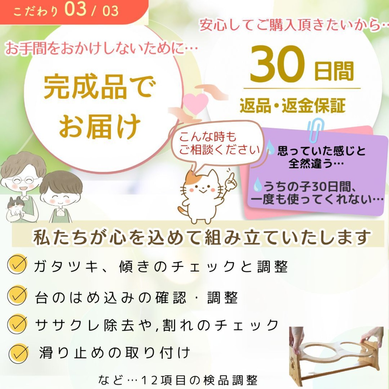 これにより、首や背中への負担や、猫ちゃんの餌の吐き戻しを軽減、